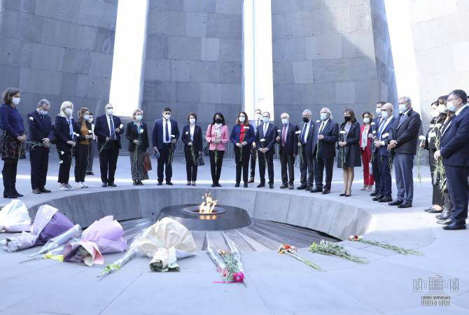 Պատուիրակութեան անդամները ծաղիկներ զետեղած են անմար կրակին մօտ` յարգանքի տուրք մատուցելով 1915-ի զոհերու յիշատակին:
