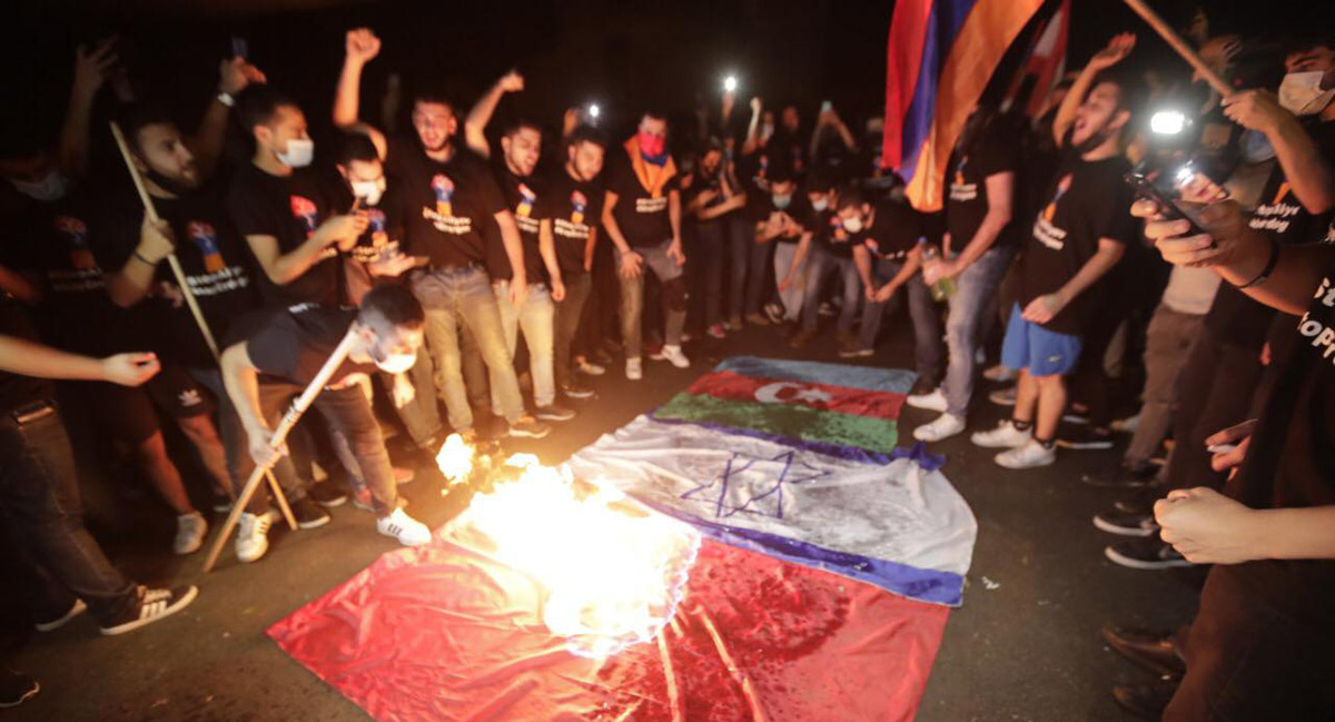 Բողոքի ցոյցին ընթացքին ցուցարարները հրկիզեցին Թուրքիոյ, Ազրպէյճանի եւ Իսրայէլի դրօշները: