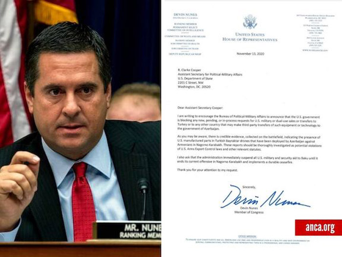 Ներկայացուցիչներու տան Հետախուզական հարցերու յատուկ յանձնախումբի բարձրաստիճան անդամ Տեւըն Նունեզ կոչ ուղղեց Սպիտակ տան, որ անմիջապէս կասեցնէ բոլոր զէնքերու վաճառքը` Թուրքիոյ եւ ռազմական աջակցութիւնները` Ազրպէյճանին: