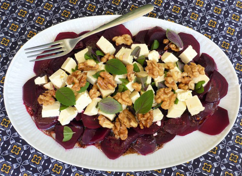 Ներկայանալի ամանի մը մէջ լեցնել կտրատուած ճակընդեղը, վրան թափել թացանը, երեսը ծածկել ֆեթա պանիրով, զարդարել ընկոյզով եւ ռեհանի տերեւներով: