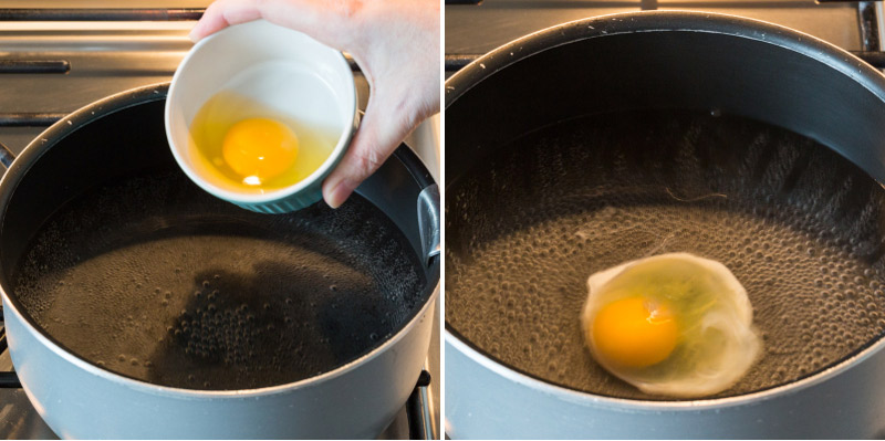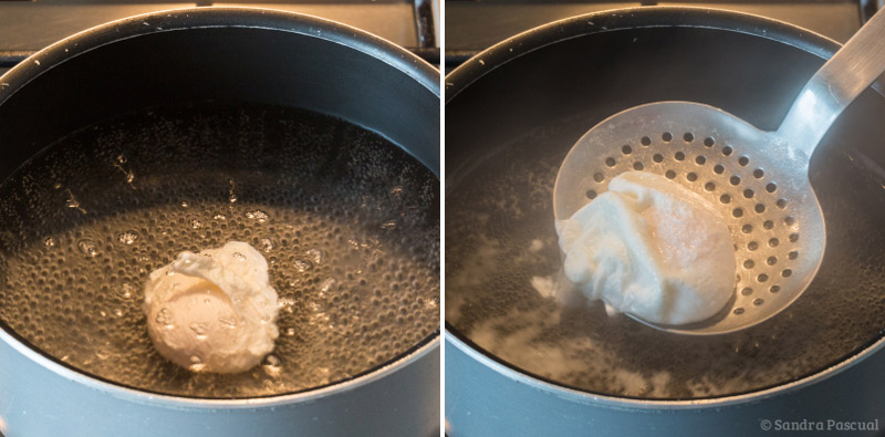 դ.- Երեք վայրկեանէն շերեփով մը ջուրէն հանել եւ զետեղել ֆրանսական հացի շերտի մը, համեղ աղցանի մը կամ դդմաճի վրայ:
