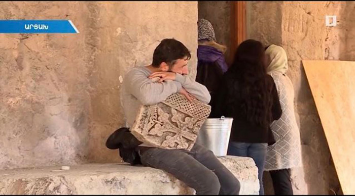 Խաչքարին կտորը գրկած, մտամոլոր նստած է երիտասարդը: Կտոր մը խաչքար:
