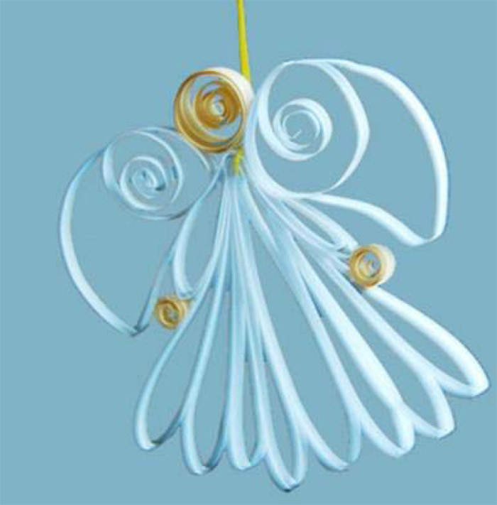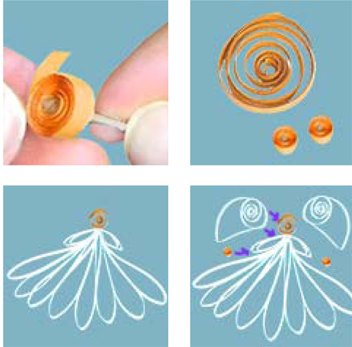 11.- Գլխուն եւ ձեռքերուն համար կրնաս գործածել ուրիշ գոյնով թուղթ: Գլխուն եւ ձեռքերուն համար երիզները փաթթէ թեւերուն նման: Ձեռքերուն համար փաթթուած երիզը սեղմ պահէ եւ անոր ծայրը փակցուր: Մինչ գլխուն համար կրնաս փաթթուածքը թոյլցնել, որպէսզի օղակները քիչ մը աւելի մեծ ըլլան: