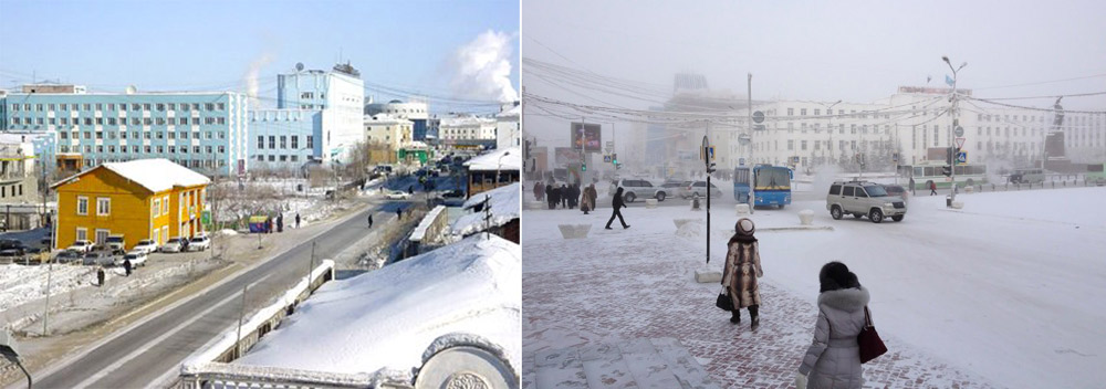 Սիպերիոյ այս քաղաքին մէջ ձմեռը սարսափելի է: 300 հազար բնակիչ ունեցող Եաքութցք քաղաքը հասարակածէն 5000 քմ հեռու կը գտնուի, այսինքն հոն, ուր արեւուն ճառագայթները ամէնէն հզօրն են: Եաքութցքի մէջ հոկտեմբեր ամիսէն արդէն ջերմաստիճանը միջին հաշուով -7 կ՛ըլլայ: Ձմեռը տակաւին չէ սկսած: Յունուար ամսուն, տարուան ամէնէն ցուրտ ամիսը, ջերմաստիճանը յաճախ -40-ի կը հասնի: