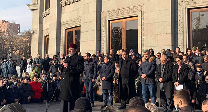 Շիրակի թեմի առաջնորդ Միքայէլ արք. Աջապահեանը իր խօսքը սկսաւ Տէրունական աղօքթով, ապա դիմեց ժողովուրդին. «Ցանկութիւնս այն է, որ մեր հայրենիքի ամբողջականութեան խաթարման պատասխանատուն հեռանայ եւ մեզի ձգէ, կարելիութիւն ստեղծէ մեր մէջքը շտկելու: Մենք միայն այսօր չէ, որ սուգի մէջ պէտք է ըլլանք, մենք 84 օր է սուգի մէջ ենք: Այսօր թշնամին հասած է Սիւնեաց սահմաններ, ոտքով կը մտնէ, թիզ առ թիզ կը հաշուէ: Մեզի կ՛ըսեն, թէ ոչ մէկ միլլիմեթր պիտի զիջինք: Զիջելու տեղ մնա՞ց»: