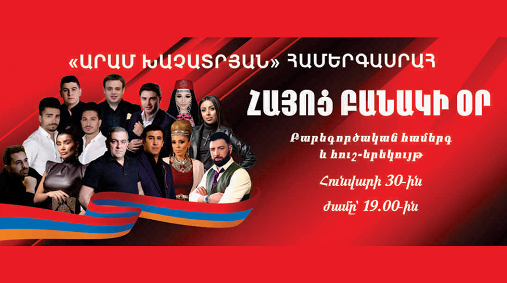 Հայոց բանակին օրուան առիթով եւ պատերազմի ընթացքին նահատակուած զինուորներուն յիշատակը վառ պահելու նպատակով երգարուեստի խումբ մը գործիչներ հանդէս պիտի գան բարեսիրական համերգով, որ տեղի պիտի ունենայ յունուար 30-ին, Արամ Խաչատրեան համերգասրահին մէջ: