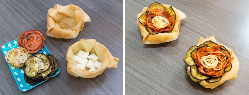 Խմորները կաղապարներէն հանեցէք, յատակը կտրտուած պանիրով ծածկեցէք, աւելցուցէք աղուած եւ համեմուած բանջարեղէնները` ծաղիկի ձեւ տալով անոնց:
