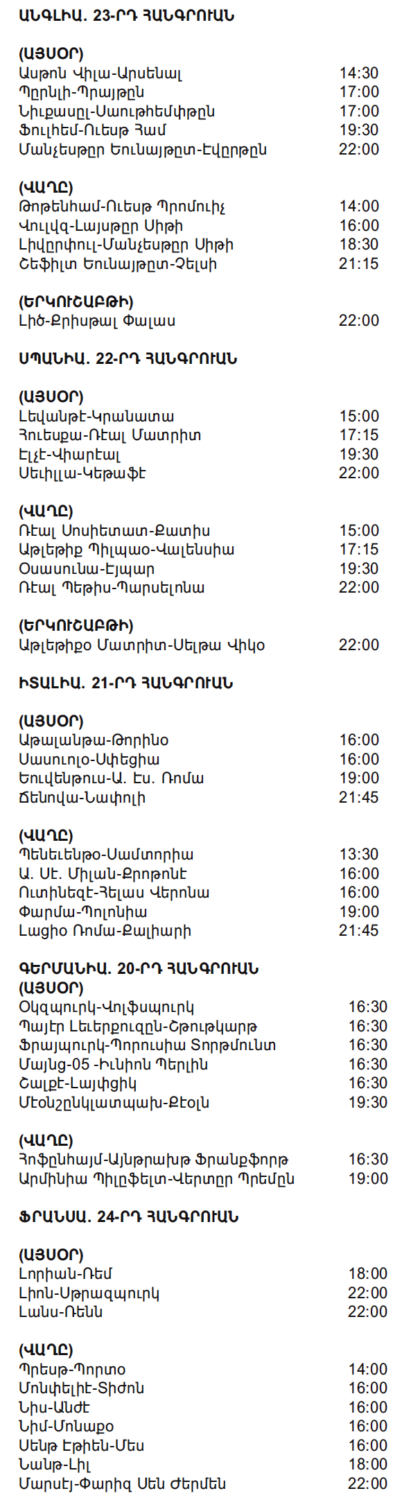Ստորեւ` շաբաթավերջին տեղի ունենալիք մրցումներուն յայտագիրը (ժամերը` Պէյրութի ժամանակացոյցով).