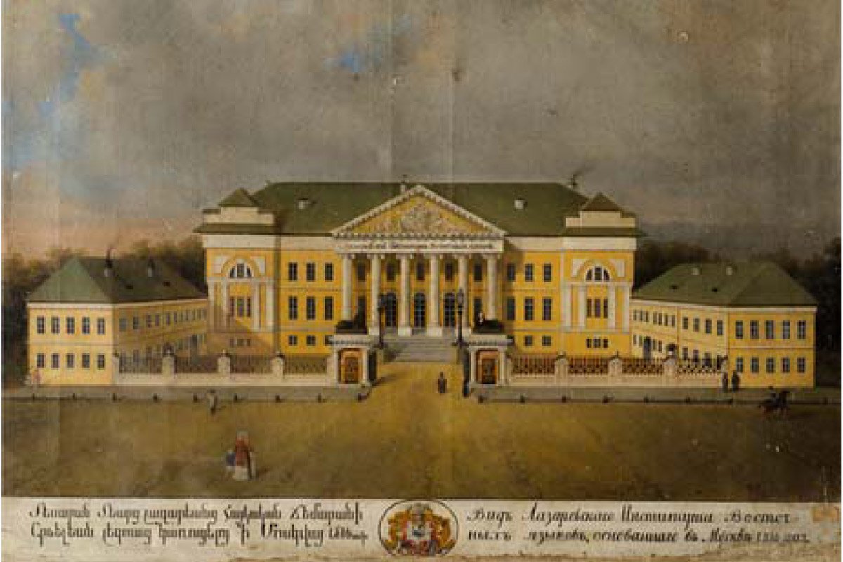 Ինքը` Լազարեանը, առաջին հայ բարձրագոյն վարժարանը` հայագիտական թեքումով, հսկայ կառոյց մըն էր, երեք անջատ բաժանմունքներով, որոնք տեղադրուած էին իրարու կից` ձեւացնելով մեսրոպեան Ս տառը: Ան ունէր մետաղեայ պատկառելի դարպաս մը, որ կը բացուէր ընդարձակ բակի մը վրայ, որուն կեդրոնը կը բարձրանար Լազարեաններուն նուիրուած պրոնզեայ շքասիւն մը: