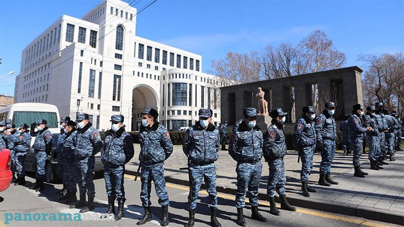 Արտաքին գործոց նախարարութեան շէնքին մօտ մեծ թիւով ոստիկաններ կուտակուած էին: Շէնքի տանիքին կանգնած էին արձակազէնները: