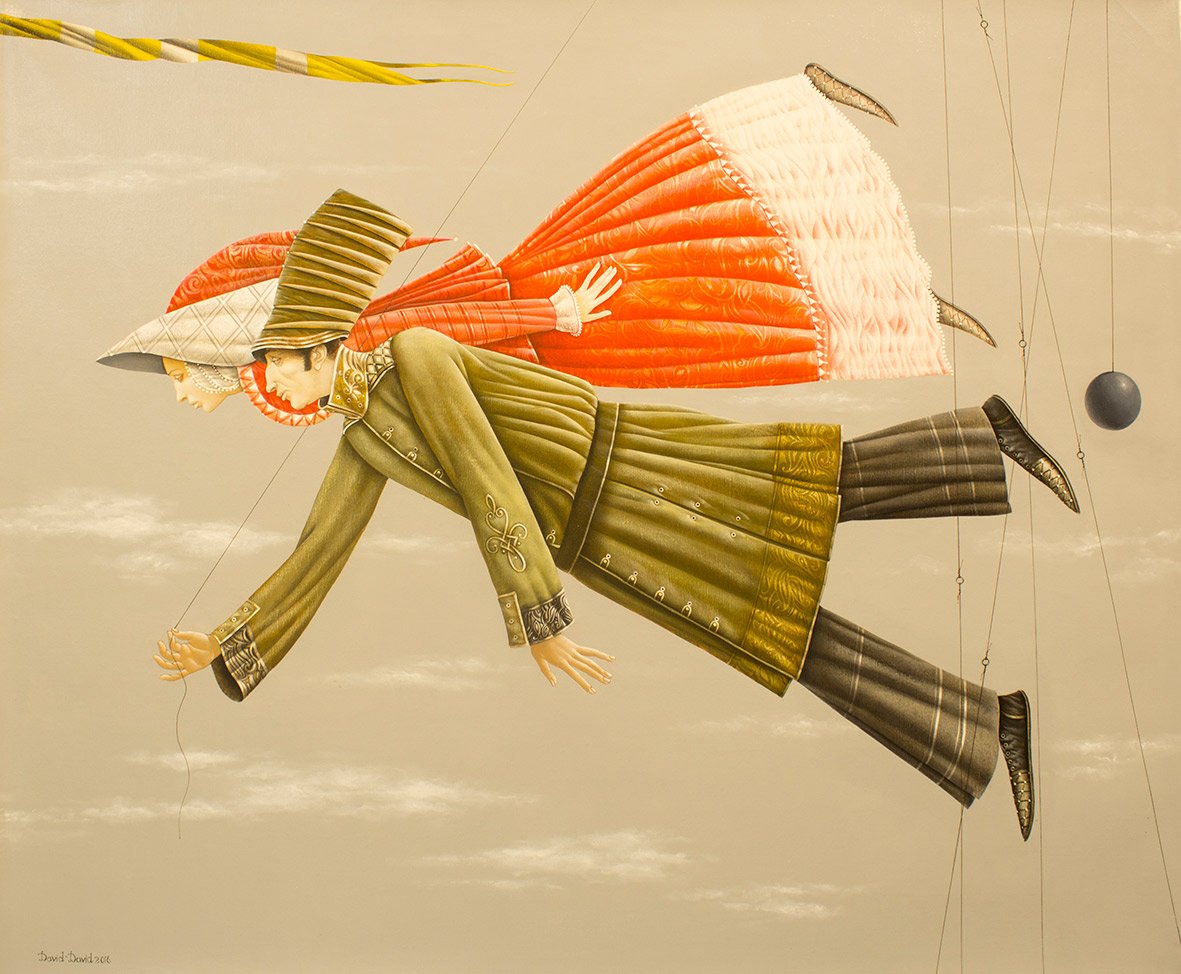 Ենթագիտակիցի թելադրականութեան տակ, անորոշ ժամանակի եւ յարափոփոխ միջավայրի մէջ, հզօր երեւակայութեամբ կերտուած Դաւիթ Դաւթեանի կերպարները սկզբնական շրջանին զուգահեռաբար ունէին թէ՛ հողային խառնուածք եւ թէ՛ հոգեւոր բնոյթ: Հողայինէն դէպի հոգեւորին ոլորտը թափանցելու գործնթացին վրայ գոյացող «գաճաճներ»-ը ժամանակի ընթացքին հասակ առին ու երկարեցան նոյնիսկ աւելի քան սովորական մարդիկ: Միջոցը «նուաճելու» Դաւիթի ներքին մղումը հետզհետէ աճեցաւ, եւ ժամանակ մը ետք անոր կերպարներէն շատեր փորձեցին անջատուիլ իրենց բոյներէն: Նախ սկսան գայթել լպրծուն տարածքներու վրայ եւ ապա, հետզհետէ ձերբազատուելով ձգողական ուժէն, շարունակեցին բարձրանալ եւ ի վերջոյ սկսան ծփալ ու թեւածել նոյնիսկ ամպերէն վեր: Դաւիթի կերպարներու երկինքն ի վեր ձգտումներու թիրախը թէեւ յստակ չէ, բայց ինքնանպատակ ըլլալու հանգամանք ալ չունի: Դժուար թէ պարզ խուսափում մը ըլլար առօրեայ տաղտուկներէն: Հաւանաբար կեանքի իմաստի որոնումն է տեսանելի եւ շօշափելի իրականութենէն անդին եւ կամ փորձ մըն է կեանքի ցանկալի հեքիաթը հիւսելու` համաձայն արուեստագէտի մարդկային ու մարդկայնական ձգտումներուն: Անոր վերջին ստեղծագործութիւններուն մէջ ի յայտ եկած թռչող տիպարները, կարծէք թէ կեանքի խորհուրդը կ՛որոնեն անորոշ ու անհեթեթ, սակայն իմանալի ծիրի մը վրայ, ուր կեանքի երթը կը շարունակուի անհուն տարածքներու եւ անկասելի ժամանակի ընթացքին: Ի վերջոյ, սակայն, անոնք առկախ կը մնան անջրպետեան առեղծուածային թելերէ, որոնք ուրկէ՞ կու գան եւ ինչո՞ւ ներկայ են հոն` չես գիտեր: Հոս անորոշութիւնը կեանքին մաս կը կազմէ արդէն, անհեթեթութիւնը կը վերածուի ապրելակերպի, իսկ անջրպետը նուաճելու երազը կը շրջանցէ իրականութիւնը, ու յղացքը կը վերածուի հոգեմտաւոր ապաստարանի: