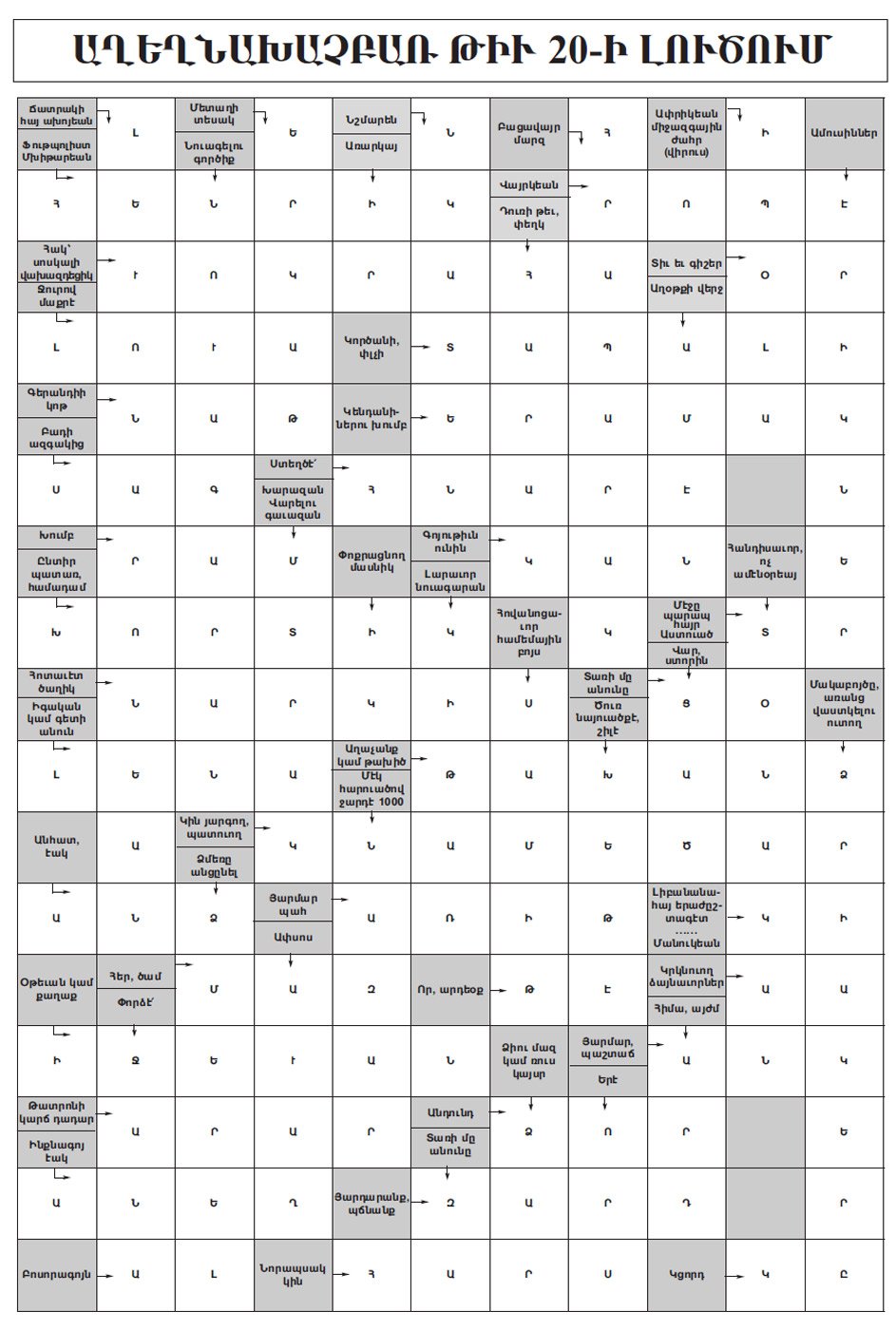 <strong>Պատրաստեց՝ ՆԱՆՕՐ ԳՈՉՈՒՆԵԱՆ-ԹԱՇՃԵԱՆ</strong> <a href="https://www.aztagdaily.com/wp-content/uploads/2021/04/agheghnakhatchpar-No-20-loudzoum.jpg"><img class="aligncenter size-full wp-image-506215" src="https://www.aztagdaily.com/wp-content/uploads/2021/04/agheghnakhatchpar-No-20-loudzoum.jpg" alt="" width="943" height="1400" /></a>