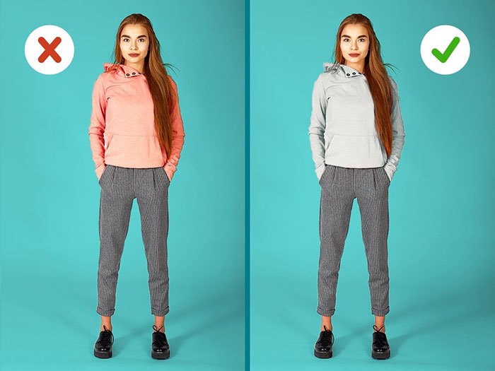 Հակադրուող եւ շեշտուած գոյները մարմինը մասերու կը բաժնեն, հետեւաբար աւելի բարձրահասակ երեւալու համար ընտրեցէք նոյն երանգի, ներդաշնակ գոյներ: