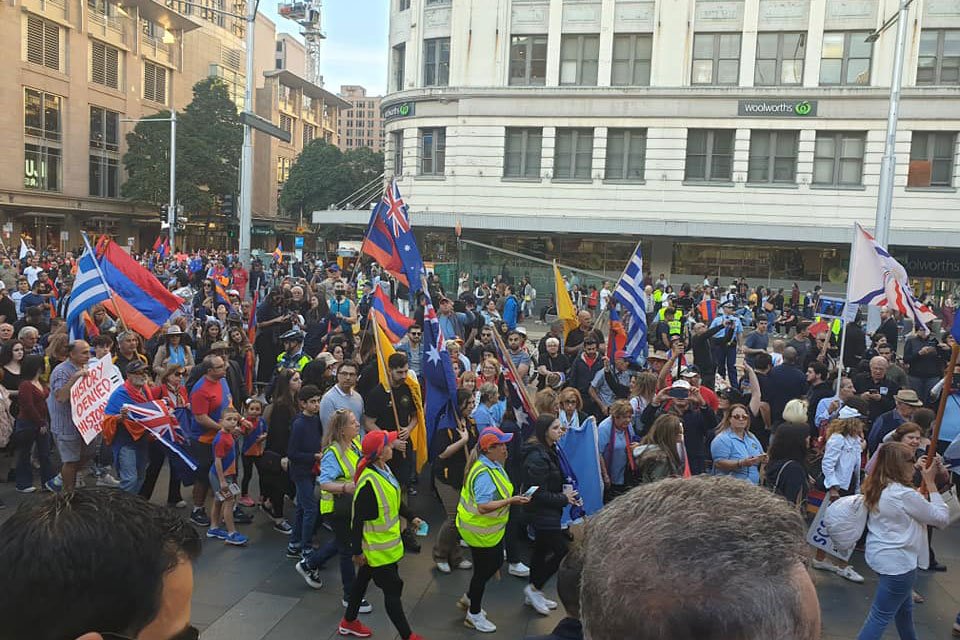 24 ապրիլին Աւստրալիոյ Սիտնի քաղաքին մէջ կազմակերպուեցաւ բողոքի ցոյց մը, որուն մասնակիցները կոչ ուղղեցին երկրի կառավարութեան` ճանչնալ Հայոց ցեղասպանութիւնը եւ 1915 թուականին Օսմանեան կայսրութեան մէջ հայերու, ասորիներու եւ յոյներու հետ տեղի ունեցածը ընդունիլ որպէս ցեղասպանութիւն: