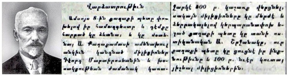 Երկրորդ պատկերը հարուն էլ ռաշիտեան է: «Աշխատանք» թերթը 19 յուլիս 1919-ի թիւին մէջ կը գրէ (6). «Ամսոյս 8-ին (յուլիս 1919, Երեւան) քաղաքի պետը փոխելով իր համազգեստը եւ հարբած ձեւանալով` կը մօտենայ Ա. քաղաքամասի ամենախուլ անկիւնը կանգնած միլիցիոներ (պահակ, ոստիկան) Գէորգ Մարտիրոսեանին եւ խօսակցութեան ընթացքին կ՛առաջարկէ 500 ռուբլի կաշառք վերցնել. սակայն պահակը կը մերժէ եւ ձերբակալելով զայն` ոստիկանատուն կը տանի, ուր քաղաքապետը ինքզինք կը յայտնէ եւ 100 ռուբլի նուէր կու տայ պահակին»: