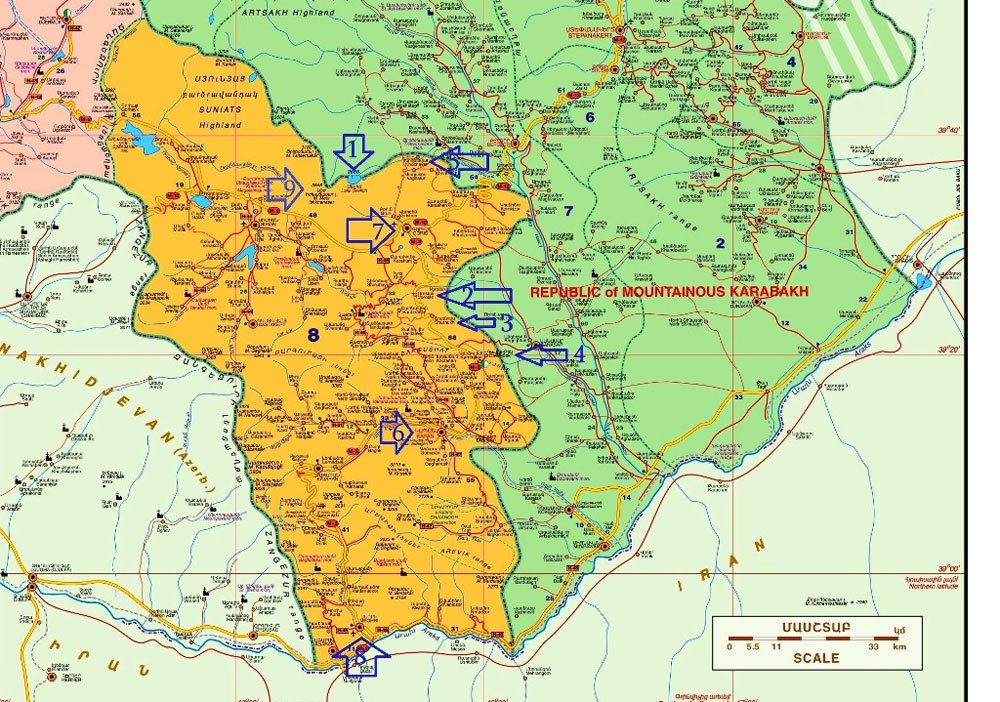 Թիւ 2, 3, 4 եւ 5 սլաքները ցոյց կու տան Որոտանը, Շուռնուխը, Դաւիթ Բէկը եւ Խոզնավարը (կան սահմանամերձ այլ գիւղեր ալ), որոնց ուղղութեամբ ազերիական յառաջխաղացքներ արձանագրուած են (իշխանութեան հաւաստիքներով, ազերիական որոշ ուժեր այս շրջաններէն ալ վերադարձած են ելման կէտեր): Տեսանելի է, թէ այդ դիրքերը ինչպէ՛ս իրենց տիրապետութեան տակ առած են Գորիսէն Արցախ տանող մայր ճամբան (չենք նշած այլ կէտեր, որոնցմէ ազերիական բանակը կը հսկէ Գորիս-Կապան մայր ճամբան, փաստօրէն որոշ հողամասեր խլած է Հայաստան-Սիւնիքէն): Յիշեցման կարգով արձանագրենք, որ սահմանային այս գիւղերը չեն գտնուիր հայկական զինուժի ազդու պաշտպանութեան տակ, Երեւանի իշխանութիւնը ետ կը մնայ զինեալ բախումէ եւ թափանցող-գրաւող բանակայինները վանելու քայլէն (թէ՛ զինուժի տկարացման եւ թէ՛ ռազմաքաղաքական նկատառումներով, որոնք յետ-պատերազմեան եւ այլ պայմաններու բերումով` որոշ չափով արդարացում կը գտնեն): Վերջապէս, թիւ 8 սլաքով ցոյց կը տրուի Մեղրին, որ այլապէս վէճի նիւթ է, որովհետեւ Ազրպէյճան եւ Հայաստան, ռուսերու մասնակցութեամբ, կը բանակցին անոր վրայով Ազրպէյճան-Նախիջեւան ճամբայ մը բանալու մասին (ճամբաներու բացումը նկատի ունի նաեւ այլ սահմաններ): Սա, ըստ Հայաստանի (եւ ըստ 9 նոյեմբերի աղէտալի պայմանագիրին), «ճամբաներու շրջափակումը վերցնել» կը նշանակէ, մինչդեռ Ազրպէյճան կը կրկնէ ու կը վերահաստատէ, որ ունի շատ աւելի լայնածիր ծրագիրներ. Իլհամ Ալիեւ չէ ծածկած, որ Զանգեզուրը կը նկատէ ազրպէյճանական գօտի (Գարեգին Նժդեհի եւ անդրանիկ հանրապետութեան օրերուն արիւնով եւ անհաւասար պայքարով Հայաստանին պահուած Սիւնիքը), իրեն համար, «Մեղրիի ճամբայ» չկայ, այլ կայ «Զանգեզուրի միջանցք», որուն խորութիւնը կրնայ Մեղրիէն մինչեւ (մօտաւորապէս) 100 քմ հիւսիս ըլլալ… Այս ծիրին մէջ դրական կէտ մը կրկնուեցաւ Երեւանէն, երբ Իրանի հետ բանակցութեանց առիթով շեշտուեցաւ, որ նման միջանցք «բացարձակապէս անընդունելի է»: Ի՜նչ խօսք, որ այս կէտին մէջ Իրանի եւ Հայաստանի շահերը լիովին համապատասխան են իրարու, որովհետեւ «միջանցքը» պատճառ պիտի ըլլայ, որ Իրան խզուի Հայաստանէն եւ կորսնցնէ դէպի հիւսիս կենսական ճամբայ մը: