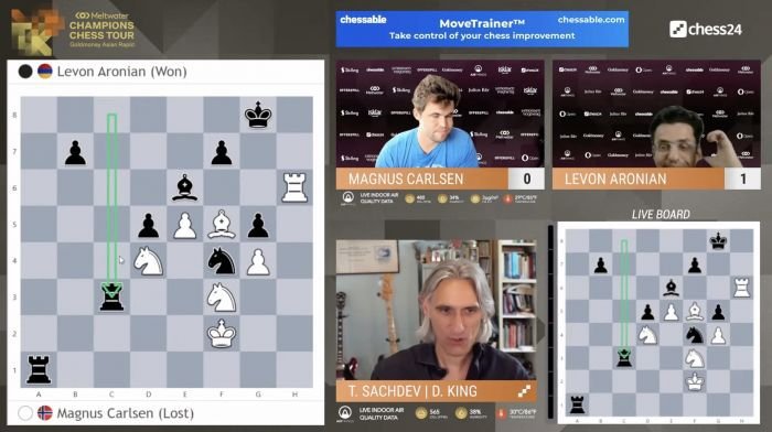 Հայաստանի ներկայացուցիչ կրանտմասթըր Լեւոն Արոնեան (2781) երէկ ապահովեց արագ ճատրակի «Կոլտմանի Ասիըն Ռափիտ» առցանց մրցաշարքի աւարտականի իր տոմսը` մրցաշարքէն դուրս ձգելով աշխարհի ախոյեան նորվեկիացի Մակնուս Քարլսընը (2847):