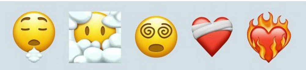 – 2021-ին, «Քորոնա» ժահրին պատճառով, միայն 5 նոր էմոճիներ լոյս տեսան` յոգնութենէն փչող դէմք մը, ամպերուն մէջ կորսուած դէմք մը (շփոթ), պարուրաձեւ աչքերով դէմք մը (յոգնութիւն, գլխապտոյտ), վիրակապով կոտրտուած սիրտ մը եւ բռնկող սիրտ մը: