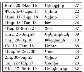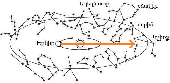Աստղագիտական.- Այս օրուան դրութեամբ կենդանակերպերը չեն համապատասխաներ տուեալ թուականներուն: Երկրի` ինքնիր շուրջ պտոյտի առանցքը, արեւու շուրջ պտոյտի առանձին բաղդատած, կը շեղի շուրջ 23,5 աստիճան: Այդ կը նշանակէ, որ հասարակածի եւ աղթարքի հարթակները (plane) զիրար կը հատեն նոյն անկիւնով: Հատման կէտերը կը համապատասխանեն գարնանային եւ աշնանային գիշերահաւասարներուն (equinox)(9): Հարցը այն է, որ Երկրի առանցքի ուղղութիւնը փոփոխական է երկու ձեւով: Անկիւնի արժէքը որոշ չափով կը փոխուի 22,1-էն 24,5 միջեւ` 41 հազար տարի պարբերութեամբ (13): Այդ հատման կէտերու փոփոխութիւն չի բերեր, ինչպէս կարելի է համոզուիլ զննելով նկարը: Կարելի չէ, սակայն, անտեսել առանցքի շուրջ 25,8 հազար տարի պարբերութիւն ունեցող պտոյտը, որ կը կոչուի կանխում (precession): Այս նիւթին նախապէս անդրադարձած եմ (2,10):
