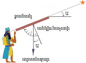 - Հաւանաբար կը գործածէին անկիւնաչափ, տրամալար, քանակ եւ հաւանաբար ջուրի ժամացոյց, որպէսզի չափեն տեղափոխումներու արագութիւնը: Կողքի (իմ համադրած) գծանկարը կու տայ իմ պատկերացումս: Տրամալարը եւ անկիւնաչափը վաղուց ծանօթ գործիքներ էին: Երկրորդ անկիւնաչափի մը միջոցով կարելի էր չափել տուեալ աստղի հորիզոնական հարթակի մէջ ուղղութիւնը բաղդատած հիւսիսային աստղին: Երկակամարի համակարգումի հեռաւորութիւնները (coordinates) արձանագրուած են մատնաչափով եւ արմկաչափով: