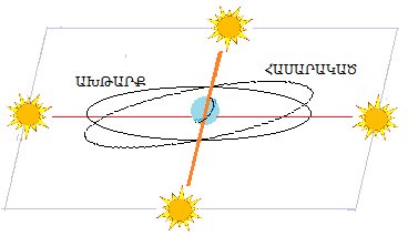 Արեւը կը գտնուի աղթարքի հարթակին (plane) մէջ: Երկիրը կը գտնուի աղթարքի հարթակի եւ հասարակածի հարթահի հատման (interection) գծի կեդրոնը: Այդ գիծը կը պարունակէ երկրի տրամագիծը ուրեմն ուղղահայեաց է հասարակածին: Ուրեմն երբ Արեւը գտնուի հատման գծին վրայ, ճառագայթները ուղղահայեաց (perpendicular) կ՛ըլլան հասարակածին: Այդ կը նշանակէ գիշերահաւասար: Ճառագայթներու անկիւնը փոքրագոյն կամ մեծագոյն են արեւադարձային կէտերու վրայ: