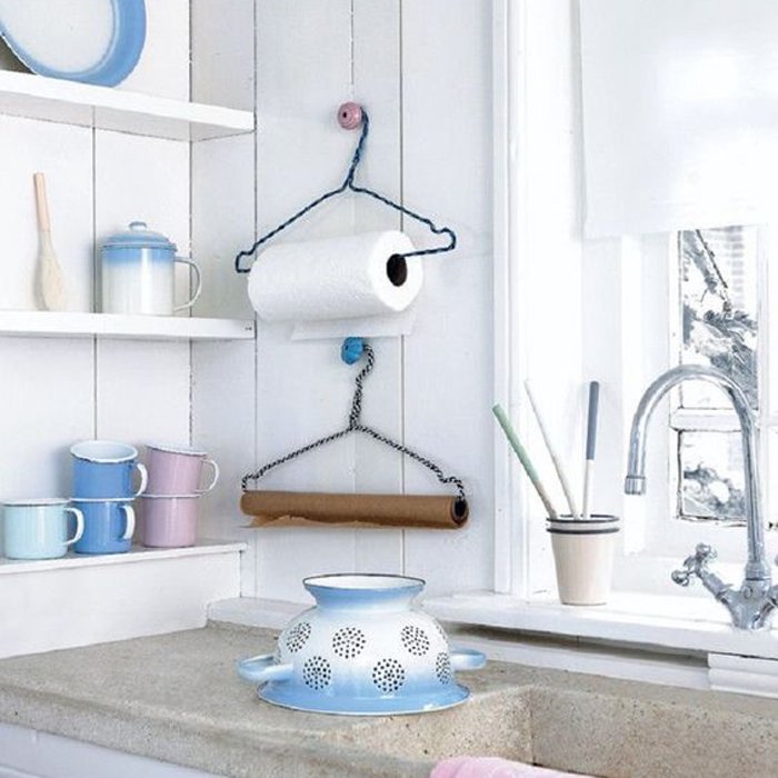 – Մետաղեայ անգործածելի հագուստի կախիչներուն վրայ կարելի է հաստատել թուղթէ թաշկինակի, ալիւմինիոմ թերթի կամ մոմեայ թուղթի գլանները եւ կախել խոհանոցի պատէն: