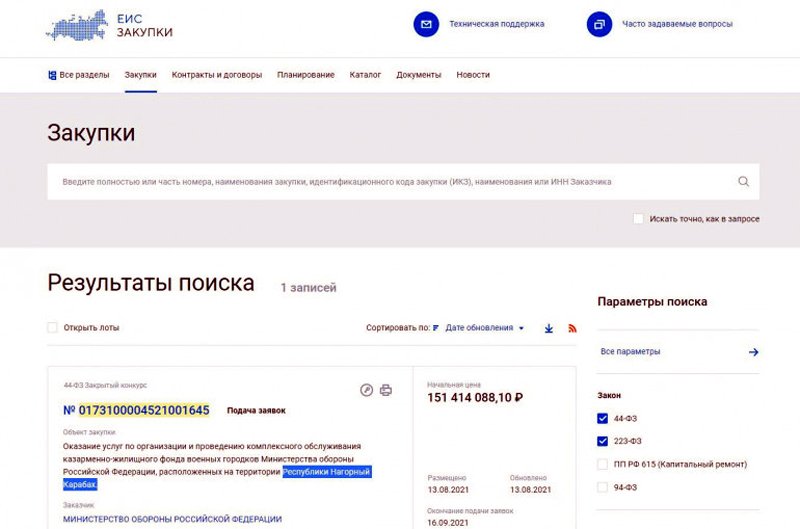 Ռուսիոյ կառավարութեան միասնական տեղեկատուական համակարգի կայքին վրայ օգտագործուած է Լեռնային Ղարաբաղի Հանրապետութիւն եզրը: «Արմէնփրես»-ի համաձայն, կայքի գնումներ բաժինին մէջ հրապարակուած է Ռուսիոյ պաշտպանութեան նախարարութեան դիմումը` Լեռնային Ղարաբաղի մէջ տեղակայուած զինուորական աւաններու զօրանոցային-բնակարանային ֆոնտի կազմակերպման եւ համալիր սպասարկման ծառայութիւններու մատուցման համար: