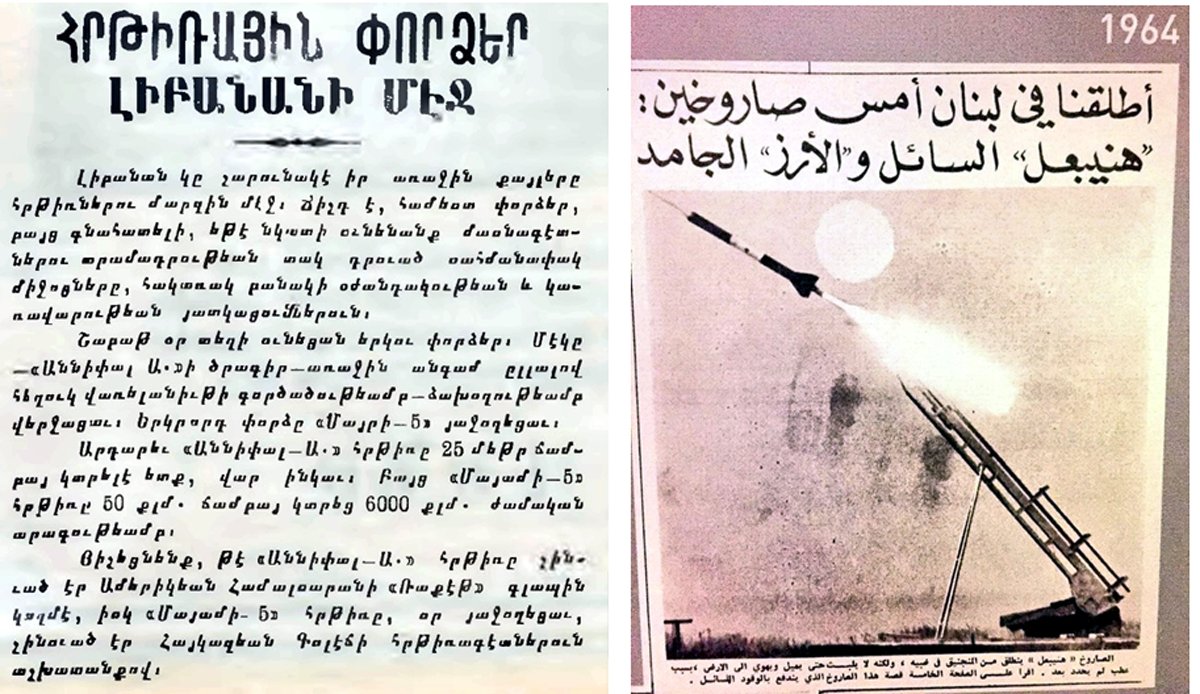 «Ազդակ» 25 մայիս 1964-ի թիւին մէջ «Հրթիռային փորձեր Լիբանանի մէջ» խորագիրով կը գրէ (7). «Լիբանան կը շարունակէ իր առաջին քայլերը հրթիռներու մարզին մէջ: Ճիշդ է` համեստ փորձեր, բայց գնահատելի, եթէ նկատի ունենանք մասնագէտներու տրամադրութեան տակ դրուած սահմանափակ միջոցները` հակառակ բանակի օժանդակութեան եւ կառավարութեան յատկացումներուն: