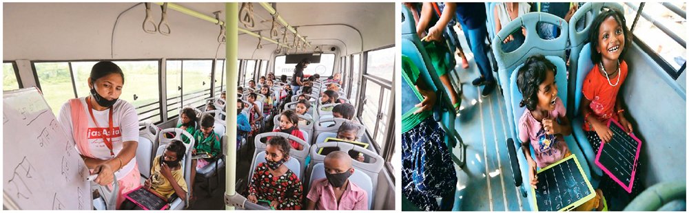 Այս փոխադրակառք-դպրոցը յաճախող մանուկներուն մեծ մասը գաղթականներու, բանուորներու եւ նոյնիսկ անտուն ընտանիքներու զաւակներ են: Այս շրջուն դասարանը կրնայ ընդունիլ մինչեւ 50 աշակերտ նոյն ատեն: Հոն կը դասաւանդուին անգլերէն, հնդկերէն եւ թուաբանութիւն. դասերը կը տեւեն ընդամէնը երկու ժամ: Ուսումի կողքին, այս իւրայատուկ դպրոցը իր աշակերտներուն կը հայթայթէ նաեւ կէսօրուան ճաշ: