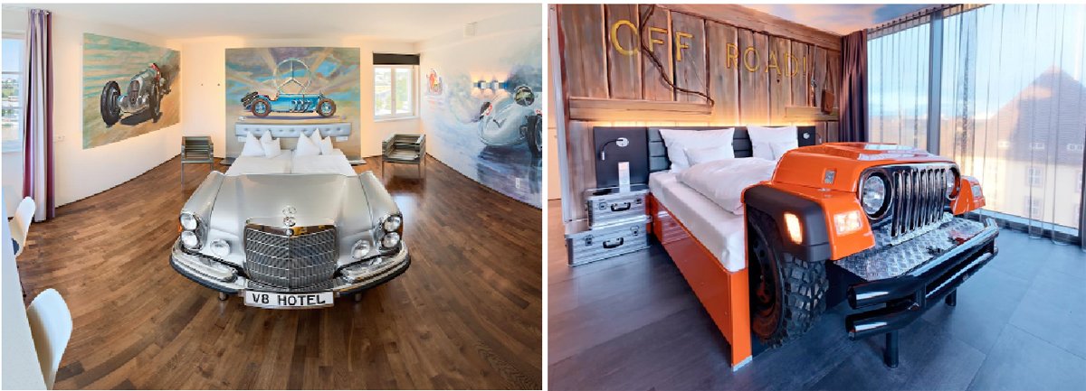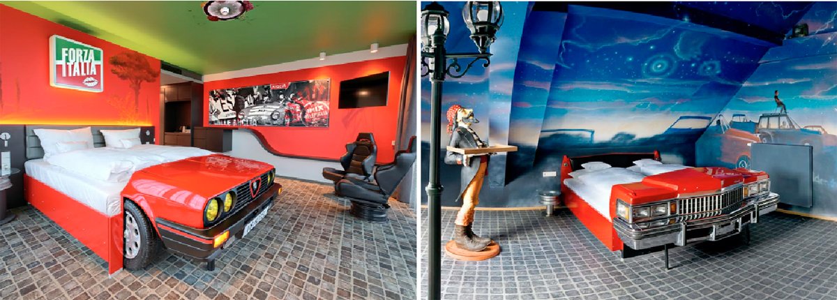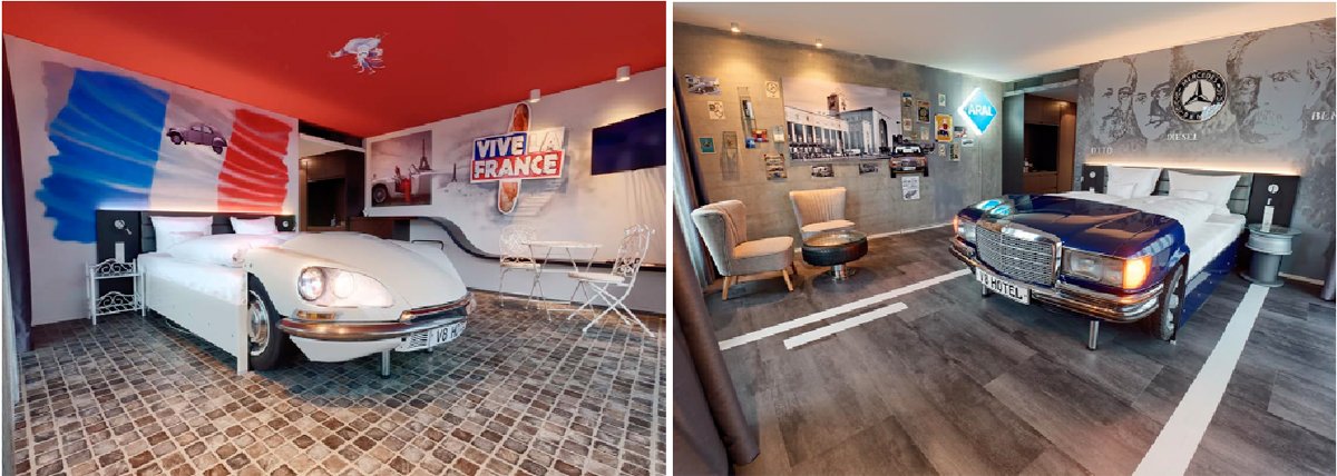 Այս ձեւով պանդոկին մէջ կեցութեան ընթացքին դուք ընտրութիւնը պիտի ունենաք կենալու Իտալիոյ սենեակին մէջ, անոր` 1970-ական թուականներու «Ալֆա Ռոմէօ» ինքնաշարժէ անկողինով, կամ Ֆրանսա սենեակին մէջ` «Սիթրոեն ՏՍ» անկողինով, կամ` «Մերսետես»-ի, «Փորշ»-ի, «Ճիփ»-ի, «ՊՄՎ» «Ճակուար» եւ բազմաթիւ ուրիշ ծանօթ ինքնաշարժներու յատկացուած սենեակներուն մէջ: