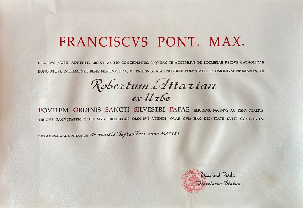 Ուրախութեամբ կ՛ուզենք յայտնել, որ մեր գործընկեր Ռոպէր Աթթարեան արժանացած է սրբազան քահանայապետի Վատիկանի քահանայապետական «Սան Սիլվեսթրօ Պապ» (San Silvestro Papa) շքանշանին՝ մամլոյ մարզին մէջ իր ունեցած դերակատարութեան եւ վաստակին համար։