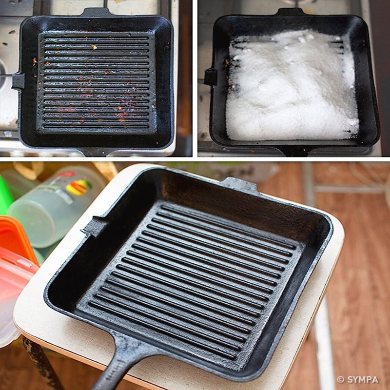 Տապակին այրած յատակը մաքրելու համար առատ աղ ցանեցէք, սպասեցէք քառորդ ժամ, ապա սպունգին կարծր երեսով շփեցէք: Տապակը թեթեւ կրակի վրայ 3-5 վայրկեան ձգեցէք, կրկին շփեցէք ու սովորական լուացէք: