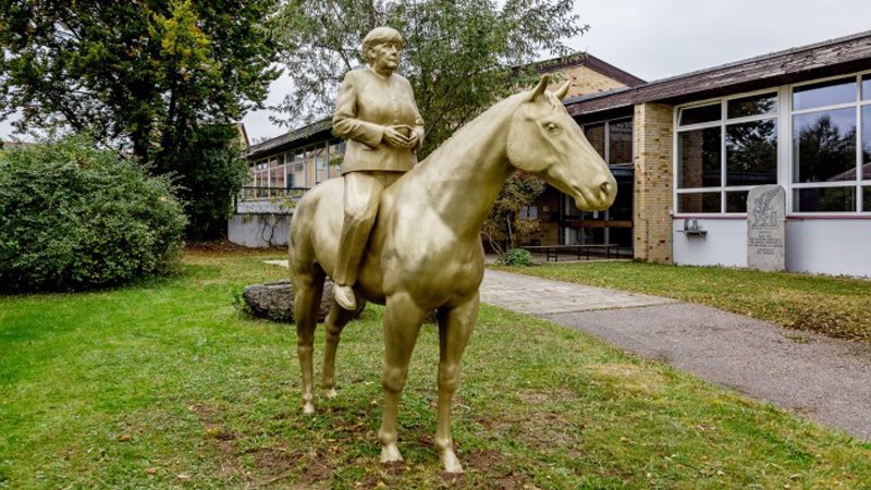 2,7 մեթր բարձրութեամբ արձանը կը ներկայացնէ Մերքելը` նստած ձիու վրայ: Քանդակագործը յայտնած է, որ այս արձանը յղացած է անկախ քաղաքական համոզումներէ պարզապէս զինք տպաւորած է վարչապետին ՄԱՐԴ տեսակը: