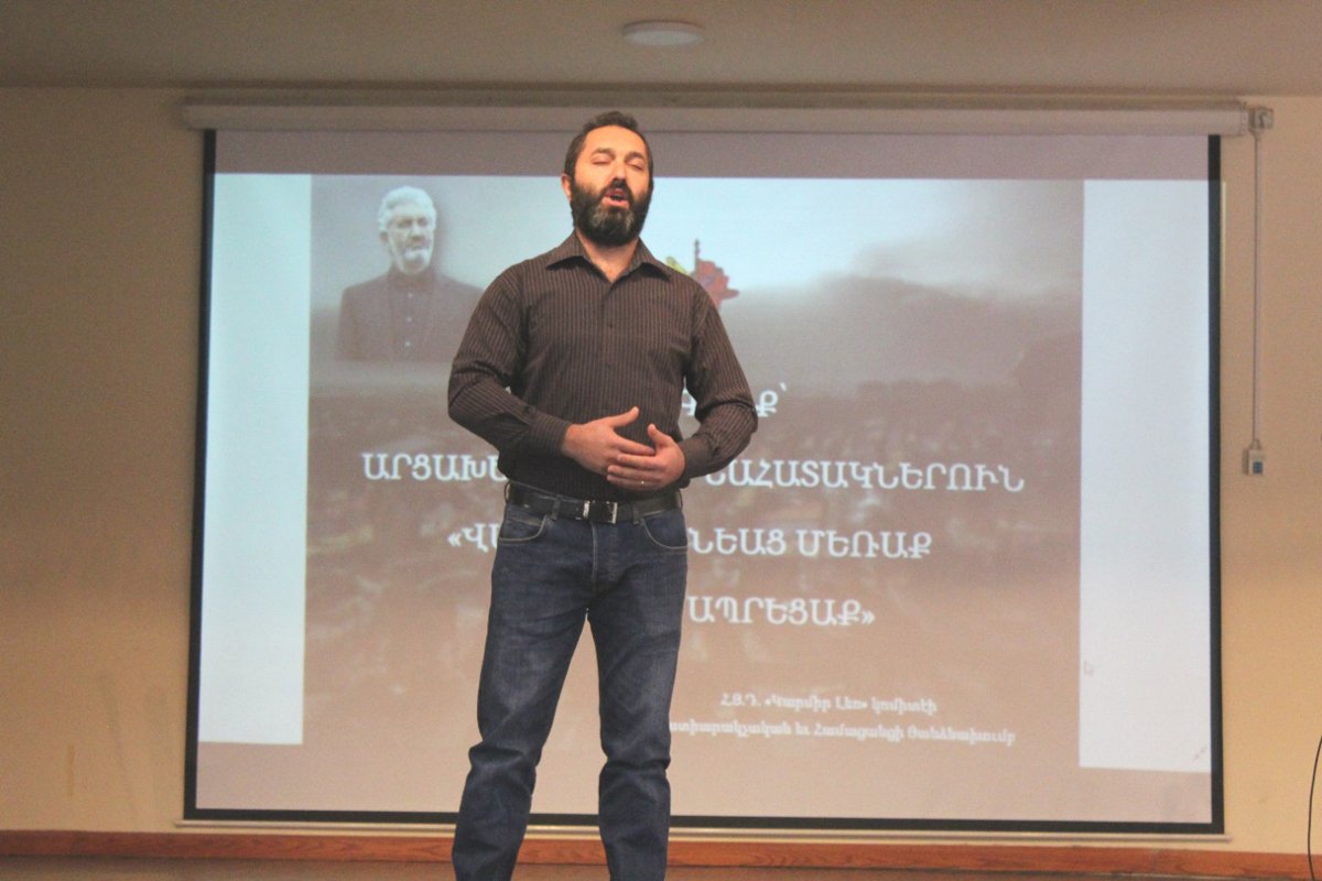 Բացման խօսքը արտասանեց ՀՅԴ «Կարմիր Լեռ» կոմիտէի դաստիարակչական եւ համացանցի յանձնախումբի անդամ Ալին Քենտիրճեանը, որ նախ ներկաներէն խնդրեց մէկ վայրկեան յոտնկայս լռութեամբ յարգել նահատակ Գէորգ Հաճեանի եւ արցախեան բոլոր նահատակներուն յիշատակը. ապա ըսաւ. «Ով կամաւոր է գրւում, այն օրից հերոս է նա, Իր ազգի ազնիւ կռւում ամենամեծ յոյսն է նա…». այս երգը, ո՜վ գիտէ, քանի՛ անգամ հնչած է Գէորգ Հաճեանի շրթերէն… հայրենասիրական, ազգային, կոմիտասեան ու հոգեւոր երգերու վարպետ, որ տարիներ իր անզուգական ձայնով բարձր պահեց հայու պատիւը աշխարհի տարբեր բեմերու վրայ, դաստիարակեց ու խրախուսեց սերունդներ` սկսած Այնճարի «Յառաջ» պատանեկան միութենէն հասնելով մինչեւ արցախեան բանակի զինուորներուն, այս եւ նման երգերով ան սփոփեց նահատակ հերոսներու մայրերուն վիշտը… ու թերեւս այս երգին կամ հայրենասիրական ուրիշ երգի մը բառերը շրթերին, տարի մը առաջ, Վարակնաթաղի բարձունքը ազատագրելու ընթացքին ինքն ալ միացաւ արցախեան նահատակներու փաղանգին»: