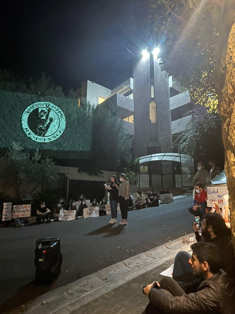 Ցուցարար երիտասարդներուն խօսքը արտասանելէ ետք, անոնք «Դիմադրութիւն» գրուած պաստառը ամրացուցին դեսպանատան դարպասին վրայ: