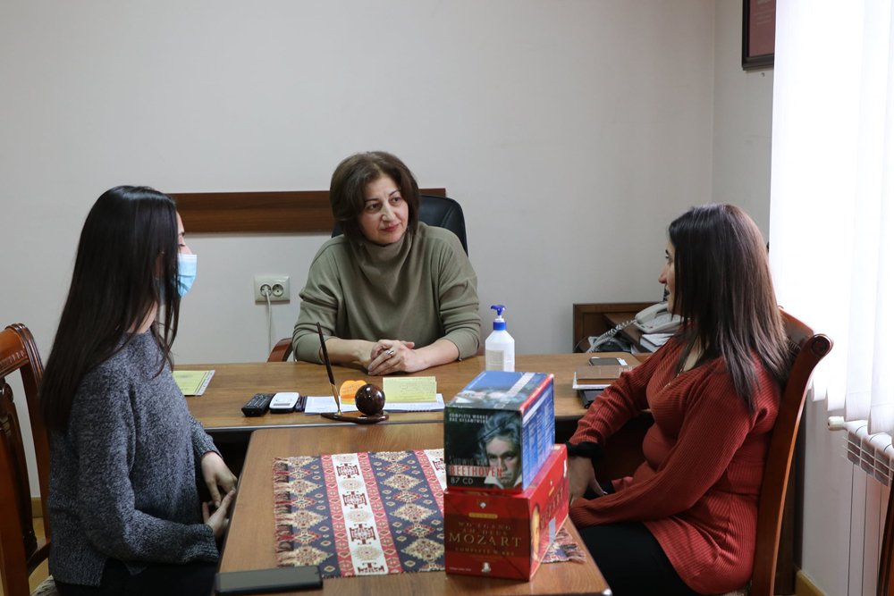 Երաժշտական քոլեճի տնօրէն Անահիտ Սուլէյմանեանի հետ հանդիպումին ներկայ էր նաեւ ՀՅԴ Արցախի Կեդրոնական կոմիտէի անդամ Ալեոնայ Դադամեանը:
