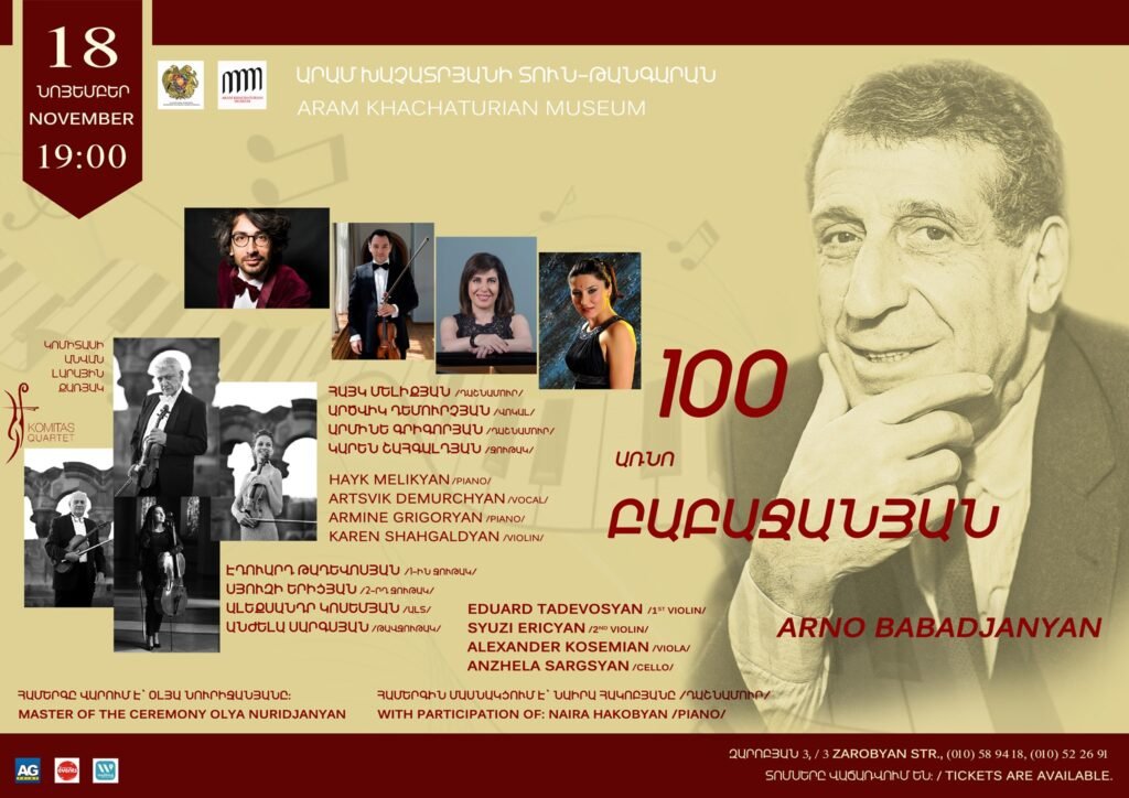 Երգահան Առնօ Բաբաջանեանի 100-ամեակին առիթով Արամ Խաչատուրեանի տուն-թանգարանին մէջ կազմակերպուեցաւ համերգային ծրագիր` հանրայայտ երաժիշտներու մասնակցութեամբ: