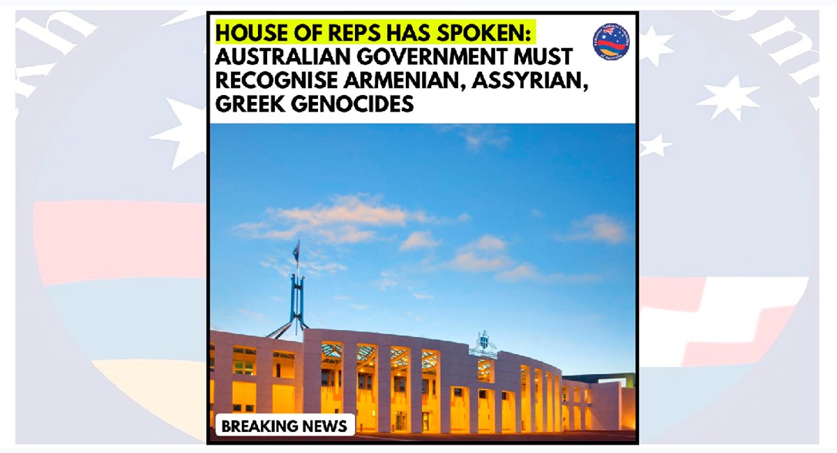 ՀՅԴ Աւստրալիոյ Հայ դատի յանձնախումբը կը հաղորդէ, որ Աւստրալիոյ խորհրդարանի Ներկայացուցիչներու տունը միաձայնութեամբ թեր արտայայտուեցաւ այն բանաձեւին, որով կոչ կ՛ուղղուի կառավարութեան` ճանչնալու Օսմանեան կայսրութեան կողմէ 1915-1923-ին հայերու, ասորիներու եւ յոյներու դէմ գործադրուած ցեղասպանութիւնները: