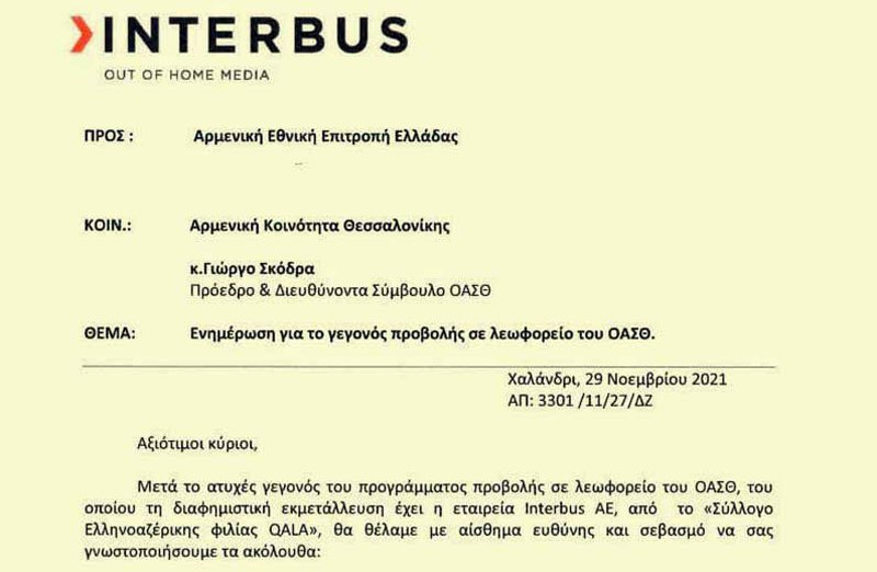 Նամակին մէջ նշուած է, թէ «ընկերութիւնը Թեսաղոնիկէի փոխադրական հաստատութեան տնօրէնին կողմէ տեղեակ պահուեցաւ ազրպէյճանական գրգռիչ քարոզչական արարքներուն մասին, որոնք կատարուեցան ազերիամէտ շրջանակներէ, ինչպէս նաեւ իմացաւ Թեսաղոնիկէի բազմամարդ հայ համայնքի եւ այլ շրջաններու համայնքներու իրաւական եւ հասկնալի հակազդեցութեան մասին»: