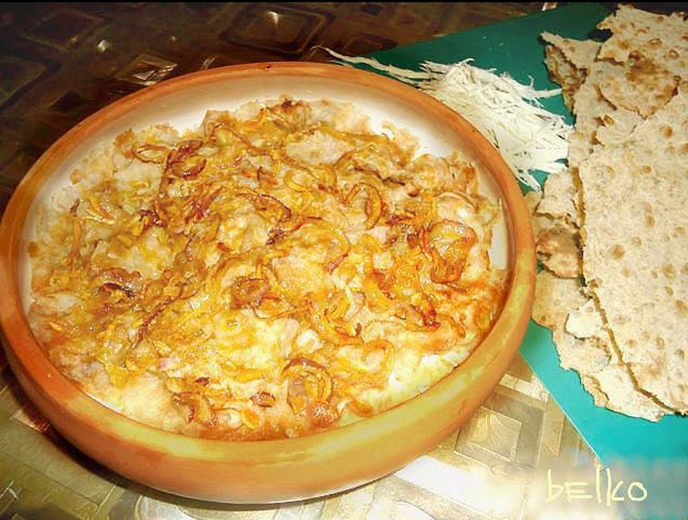 Նախապէս չորցուած լաւաշը (լիբանանեանը նոյն դերը կը կատարէ) կտրատել եւ լեցնել ամանին մէջ` որպէս առաջին շերտ: Վրան աւելցնել համաչափօրէն նախապէս թելերու վերածուած պանիրը, ապա կրկին կտրատած լաւաշ, յետոյ` պանիր: Ըստ ցանկութեան, այս հերթականութիւնը քանի մը անգամ կրկնել այնպէս, որ երեսի շերտը լաւաշ ըլլայ: Վերջաւորութեան երեսին աւելցնել նախապէս պատրաստուած սոխարածը, յետոյ այնքան մը եռացած ջուր, որ հացը քիչ մը փափկանայ, բայց ջուրը պէտք չէ որ ծածկէ հացը: