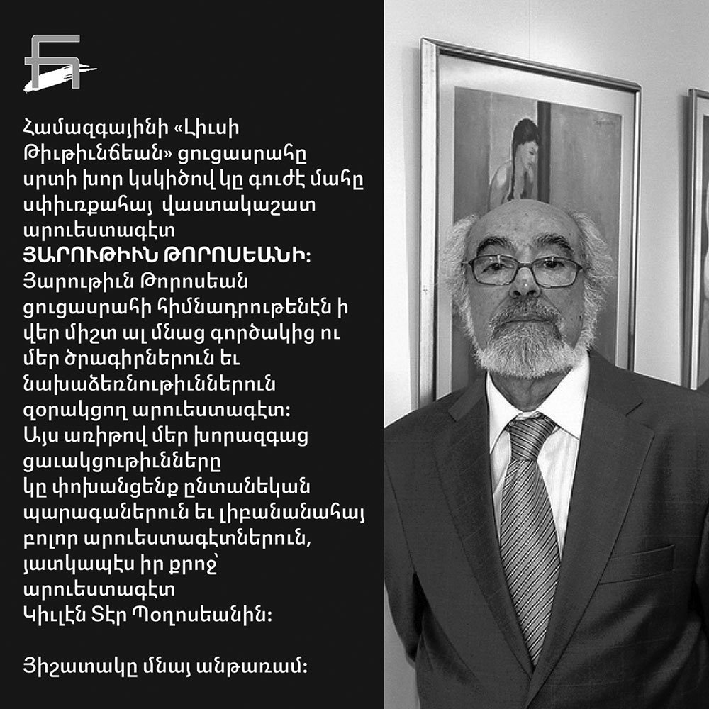Երէկ` 10 յունուար 2022-ին Փարիզի մէջ իր մահկանացուն կնքեց վաստակաշատ արուեստագէտ, արուեստի ու գեղանկարչութեան երկարամեայ դասախօս Յարութիւն Թորոսեան: