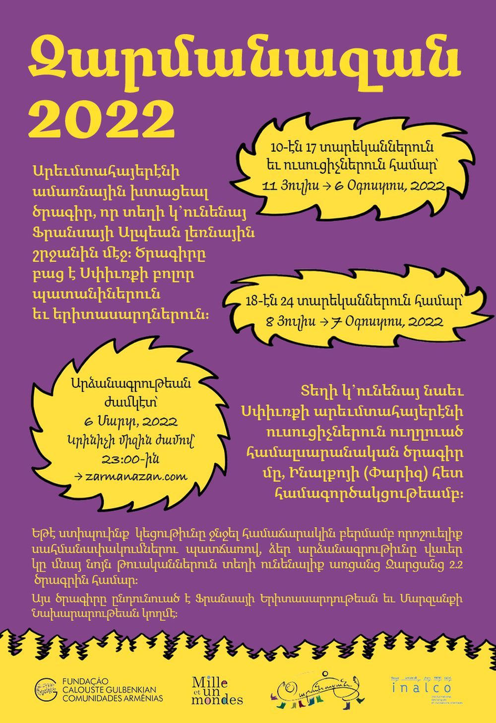 Արձանագրութիւնները սկսած են: 2022 տարեշրջանի «Զարմանազան»` արեւմտահայերէնով ամառնային ծրագիրը տեղի պիտի ունենայ Ֆրանսայի Ալպեան լեռներու «Օթ-Սաւուա» կոչուած շրջանը, 11 յուլիսէն մինչեւ 6 օգոստոս 2022: