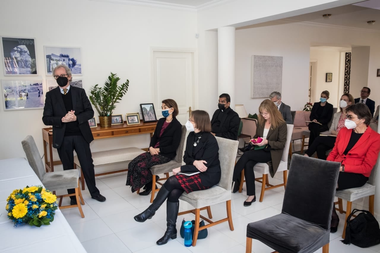 Leadership of the Religious Track of the Cyprus Peace Process (RTCYPP) under the Auspices of the Embassy of Sweden, met with a group of ambassadors and heads of diplomatic missions of the European Union member states, the USA, Switzerland, and the Holy See in Cyprus on March 14 at the Swedish Residence, hosted by Ambassador Hagelberg of Sweden.