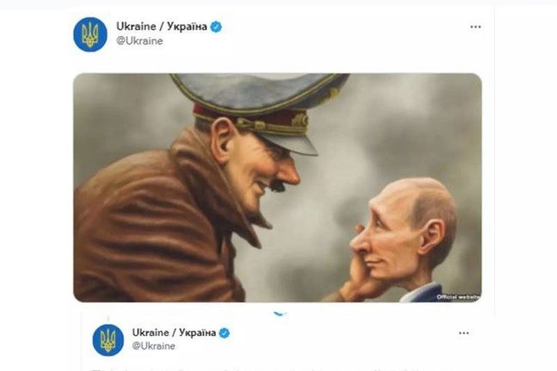 Հսկայ Ատոլֆ Հիթլեր կը ծռի եւ կը շոյէ հնազանդ Վլատիմիր Փութինի այտը, վարպետը` աշկերտին, նկարի մը մէջ, որ հրապարակուած է Ուքրանիոյ Թուիթըրի պաշտօնական էջին մէջ, 24 փետրուարին, ներխուժումը սկսելու օրը: