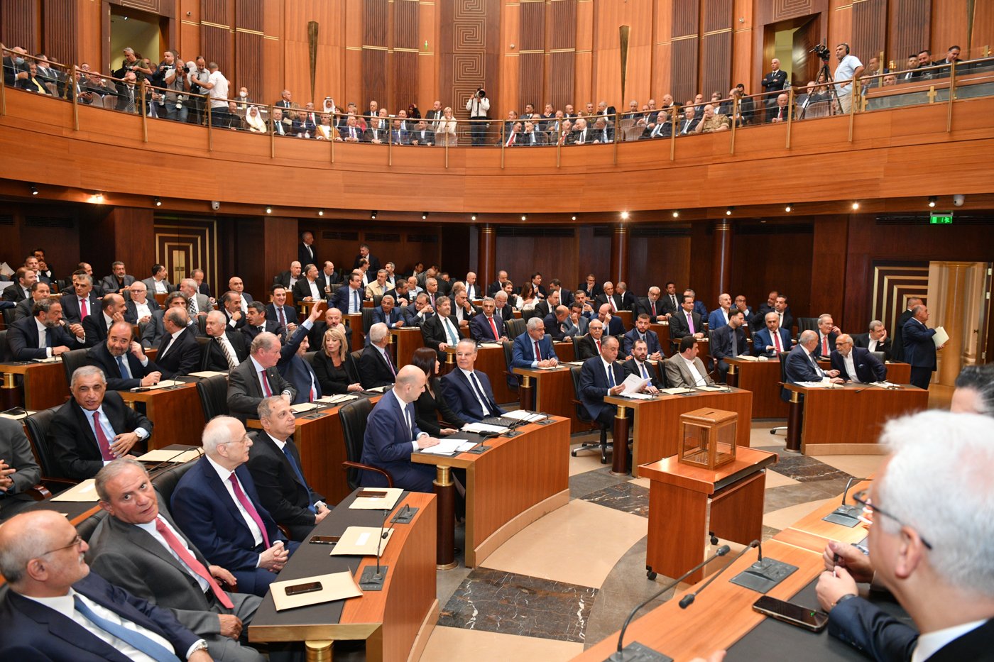 Ապա անոնց հանդիպումին միացան խորհրդարանի նորընտիր դիւանի անդամները, որոնց ներկայութեան նախագահ Աուն մաղթեց, որ նորընտիր խորհրդարանը կարենայ դիմագրաւել ներկայ մարտահրաւէրները, ինչպէս նաեւ օրէնսդրութեան ընդմէջէն փրկէ Լիբանանը` երկիրը յուզող տնտեսական եւ ընկերային տագնապէն, երկրին համար ապահովելով տնտեսական անհրաժեշտ բարգաւաճում:
