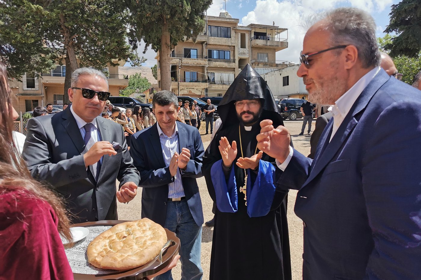 Բերդի մուտքին ՀՄԸՄ-ի Այնճարի մասնաճիւղի աստիճանաւորներու եւ փողերախումբի մասնակցութեամբ, պաշտօնական ընդունելութեամբ նախարարը դիմաւորուեցաւ Պեքաայի հայ երեսփոխան, ճարտարարուեստի նախարարի պաշտօնակատար Ճորճ Պուչիքեանի, Պեքաայի հոգեւոր տեսուչ Անանիա ծ. վրդ. Գուճանեանի, Այնճարի քաղաքապետ Վարդգէս Խօշեանի, «Կարմիր Լեռ» կոմիտէի, փոխքաղաքապետ Նազարէթ Անտէքեանի եւ գիւղին մէջ գործող հաստատութեանց ներկայացուցիչներուն կողմէ: