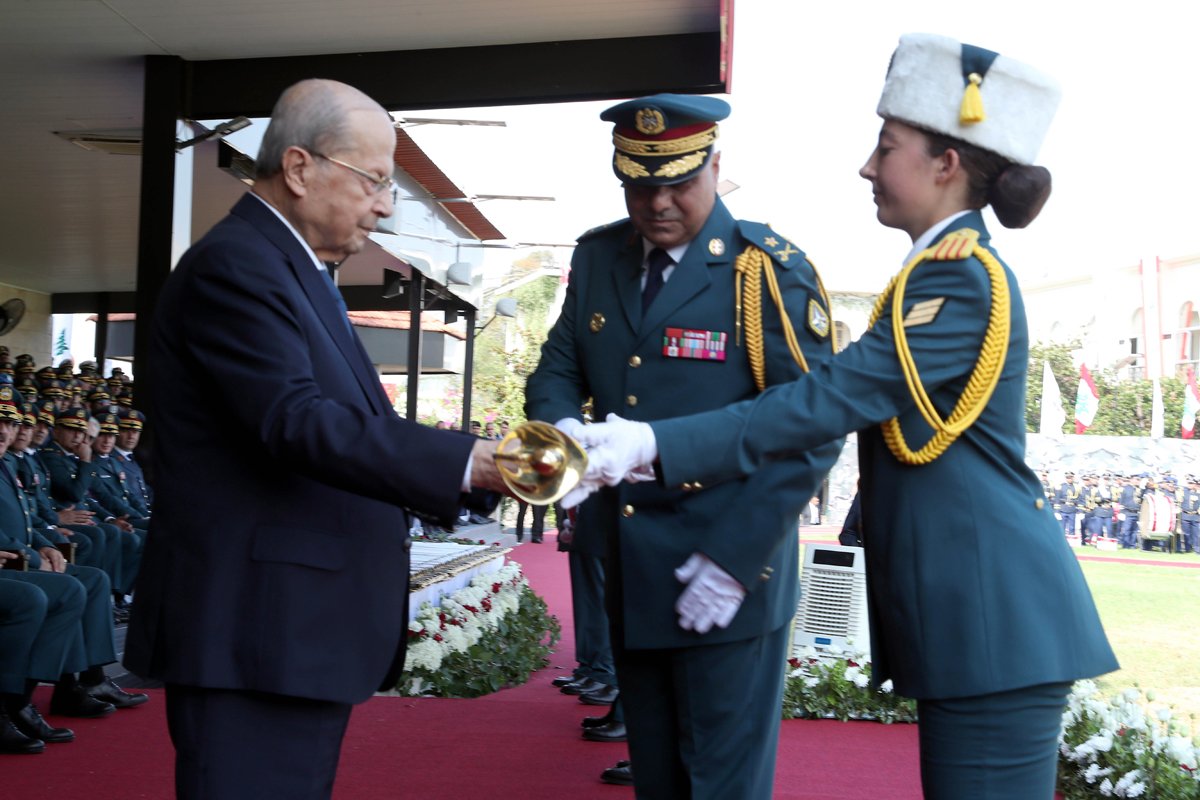 Իր խօսքը ուղղելով շրջանաւարտ սպաներուն` նախագահ Աուն յայտնեց, որ ինք վերջին անգամ ըլլալով շրջանաւարտներուն կը յանձնէ անոնց սուրերը` մաղթելով, որ անոնք իրենց խոստումին հաւատարիմ ըլլան եւ պահպանեն Լիբանանը, հաւատան անոր ապագային եւ աւելի լաւ երկիր մը կերտեն: