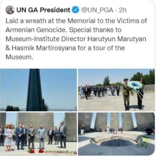 ՄԱԿ-ի Ընդհանուր ժողովի նախագահին տեղադրած ծաղկեպսակը կազմուած էր սպիտակ եւ կապոյտ ծաղիկներով, զարդարուած` կապոյտ ժապաւէնով, որուն վրայ գրուած էր «Միացեալ ազգեր»: Իր գրառման միւս լուսանկարներուն մէջ կ՛երեւէր, թէ ինչպէս ան մէկ վայրկեան լռութեամբ կը յարգէ զոհերու յիշատակը յուշահամալիրի անմար կրակին մօտ, կը շրջի Հայոց ցեղասպանութեան թանգարանին մէջ եւ կը ստորագրէ յուշամատեանին մէջ, ուր գրած է. «Ես շատ յուզուած եմ այս թանգարանը կատարած այցելութենէս: Շնորհակալ եմ ջերմ ընդունելութեան համար` Հայաստան իմ այցելութեան շրջանակներու մէջ»: