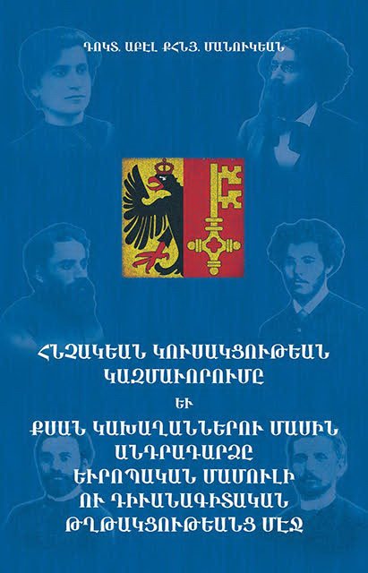 Գիրքի կողքին` Հնչակեան կուսակցութեան վեց հիմնադիրներուն դիմանկարը, կեդրոնը` պսակադիր արծիւը ու բանալին, լուսանկարը` Ժընեւի Քանթոնի զինանշանն է: