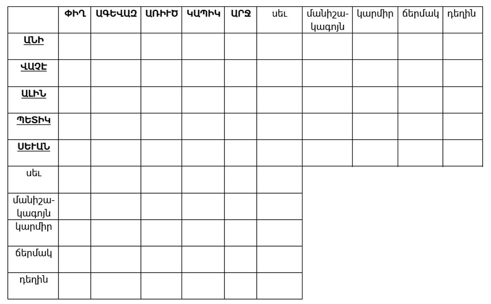 Բացատրութիւններուն հետեւելով` կրնա՞ս գտնել, թէ իւրաքանչիւր պատանի ի՛նչ գոյնի շապիկ հագուած է, եւ` անոր նախասիրած անասունը: